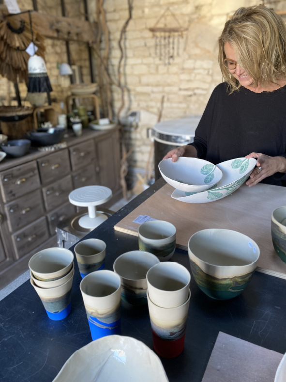 Le grès et la porcelaine sont travaillés pour donner vie à des pièces uniques, fonctionnelles et décoratives. Terre d'Aunis est né d'une rencontre avec la terre, un coup de coeur et une ambition : réaliser de la vaisselle unique, fine, légère et résistante. Le grès et la porcelaine sont coulés, modelés ou travaillés à la plaque. Les décors sont le plus souvent réalisés à l'engobe